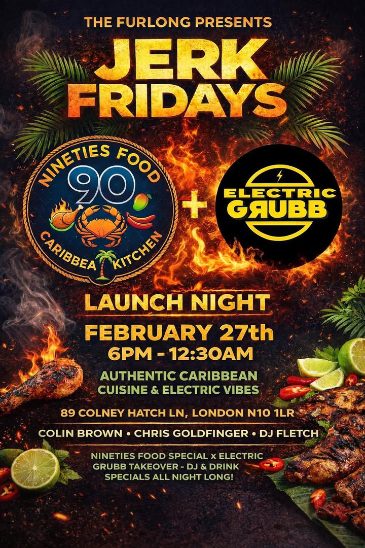 Jerk Fridays is back!!!! Join us for the launch as we welcome our new Caribbean caterers. @ninetesfood Electric Grubb! Friday 27th Jan we fire up the jerk pan again. And every Friday after they will run along side our karaoke night. Take always available Come for the food stay for the vibe